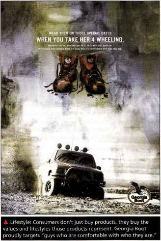 When used carefully, the lifestyle concept can help marketers understand changing consumer values and how they affect buying behavior. Consumers don't just buy products, they buy the values and lifestyles those products represent. For example, BMW doesn't just sell convertibles, it sells the convertible lifestyle: "Skies never bluer. Knuckles never whiter." A And Georgia Boot sells more than just rugged footwear, it sells a lifestyle to "guys who are comfortable with who they are." Says one marketer, "People's product choices are becoming more and more like value choices. It's not, 'I like this water, the way it tastes.' It's 'I feel like this car, or this show, is more reflective of who I am.'"