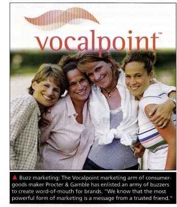 Buzz marketing: The Vocalpoint marketing arm of consumer-goods maker Procter & Gamble has enlisted an army of buzzers to create word-of-mouth for brands. "We know that the most powerful form of marketing is a message from a trusted friend.