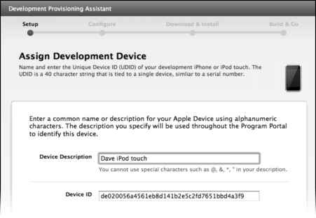 Continuing to the next screen, you'll need to enter the device description and ID of your test device. The Device Description can be any name you want. I opted to call mine "Dave iPod touch" to differentiate it from my iPhone device. Referring to your selected device in Xcode Organizer, copy the 40-character device identifier, and paste it into the assistant's Device ID field (see Figure 7-13).