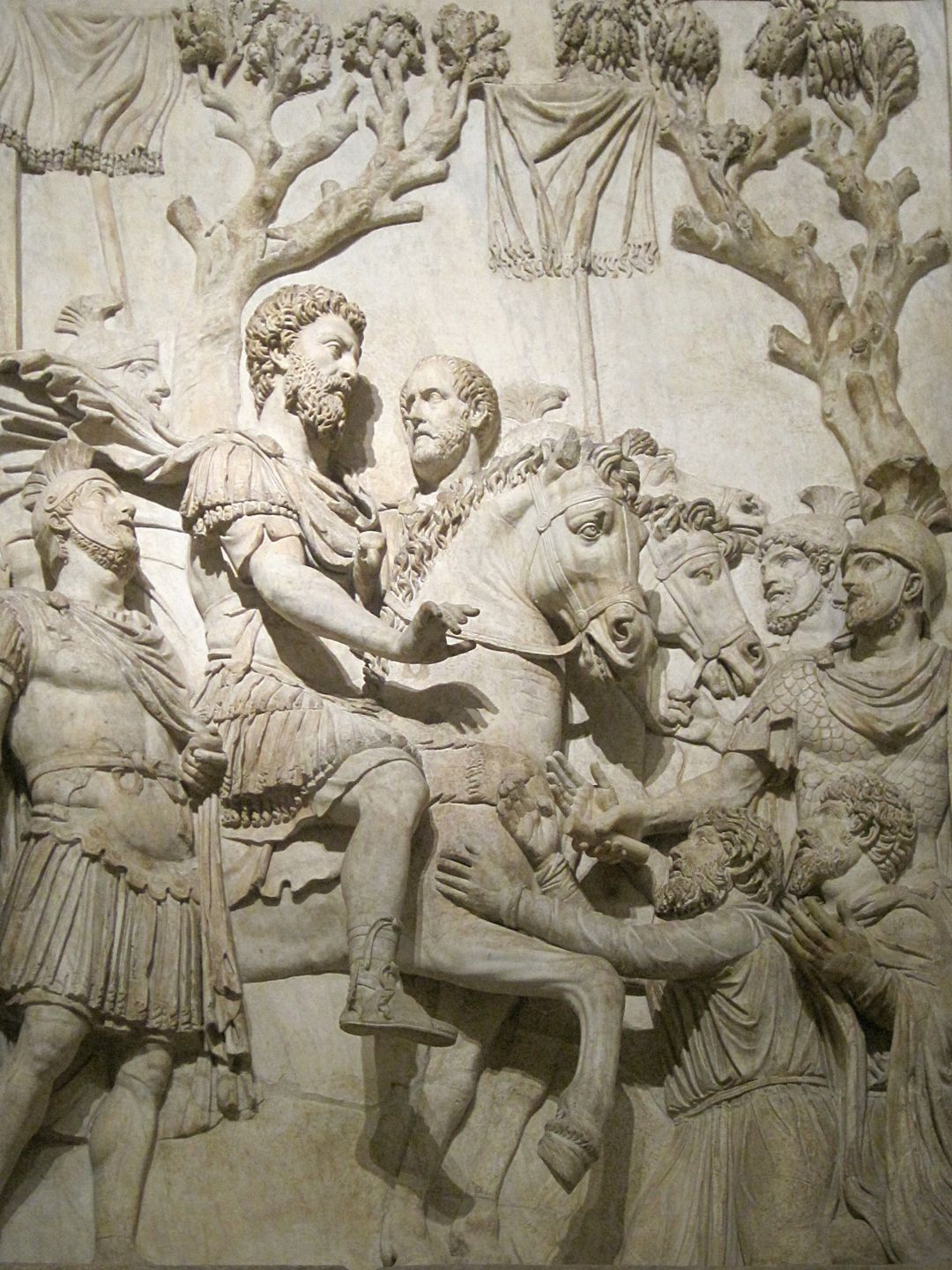 This bas relief from the arch of Marcus Aurelius depicts the emperor during the Marcomannic Wars against Germanic barbarians, 176–180 AD. Marcus is often depicted in the pose of giving clemency to vanquished enemies. (source: Wikipedia)