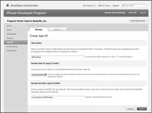 As you can see from Figure 7-24, the configuration options for Push Notifications and In-App Purchase are grayed out since they cannot be tested with wildcard App IDs. If you need to test one of those features in your application, then create a new App ID, specifying your Xcode project's reverse-domain name bundle ID as the bundle identifier. For example, I have an Xcode project called IAPTestApp that utilizes In-App Purchase, so I'll set com.ebutterfly.IAPTestApp as the App ID's bundle identifier (see Figure 7-25).