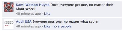 The announcement was made relating to a trial run with Audi where users are led to believe that only if their Klout is high enough, they’ll receive the Audi wallpaper or ring tone, but looking through their comments, Audi is apparently rewarding everyone, which may not be the best way to roll out the new initiative.