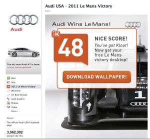 Today Mashable broke the news about the partnership between Klout and brands on Facebook – where content shared on a particular Facebook page can be dictated by the individual fan’s Klout score. Mashable writes, “In Involver’s (the company creating the app) Klout interpretation on the gate model, a Facebook user’s Klout score will determine what type of Facebook content you see and what perks, if any, you get.” Audi is the first to roll it out.